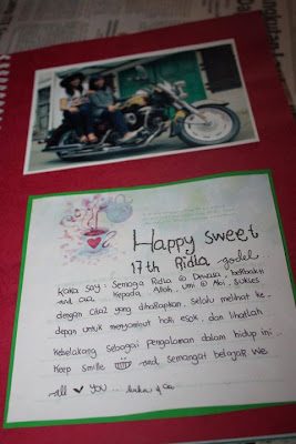 oke gue mulai cerita ya, hm gue orangnya tuhya kalo ada sesuatu sama orang yang gue sayang pasti gue perjuangin banget. ini salah satunya : RIDLA BIRTHDAY. baru kali ini perjuangannya berat banget. awalnya gue mikir kado buat ridla apa ya, nah pas gue ngesearch gitu gue tertuju sama 'scrapbook' yasudah tanpa fikir panjang lagi gue langsung membeli bahan-bahan untuk scrapbook di gramed. gue sih alasannya ke ridla beda hehe maaf ya bohong dikit kan demi kebaikan hihi :D oke jauh jauh hari gue udah bikin itu semua. penuh perjuangan juga sih hehe soalnya sempat dimarahin bokap gara-gara keseringan buat itu. hm setelah gue spiral dan menyusun kertas itu, gue berlanjut untuk mengumpulkan foto-foto dan gue minta bantuan teman-teman untuk berpartisipasi untuk menulis ucapan kata kata utuk ridla. foto satu demi satu gue cicil cuci kenapa harus nyicil ? karena ngedapetin itu foto lumayan agak ribet, kehalang sama modem gue yg masa tenggangnya mau habis HAHA.